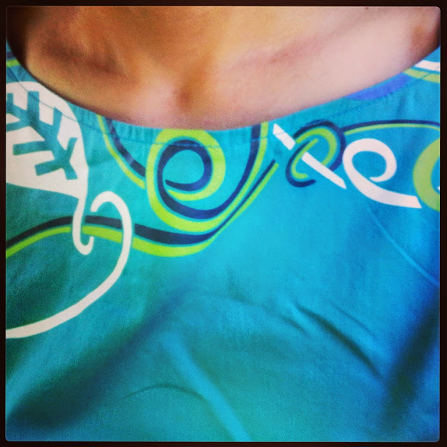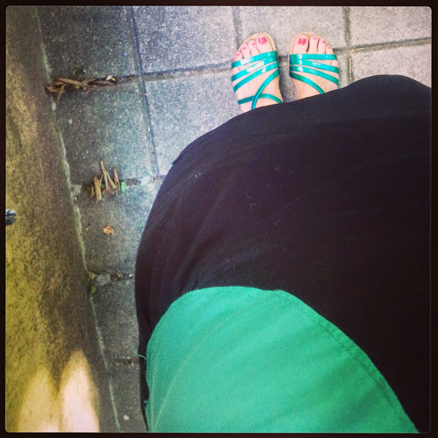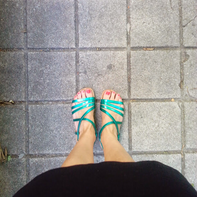 Continuo a vestir o que há, neste caso um vestido (visto da lateral) e umas sandálias compradas no ano passado. Não conta assim tanto, não foi comprado este ano mas foi no ano passado, sendo assim não é tão difícil como parece. Mas é. Às vezes aquilo que parecia perfeito há um ano já não parece ficar tão bem (ainda por cima parece que está cheio de pelo branco, mas eu não tenho gatos). Esta combinação sim, parece óbvia: vestido preto com um bocadinho de verde e sandálias verdes mesmo a combinar (a carteira também é verde, com uns bonequinhos), mas às vezes o que é demasiado perfeito cansa. Não me estou a queixar. Só a divagar. Hoje entrei noutra loja com promoções e voltei costas a dizer "nem pensem", há-de haver coisas tão giras bem mais baratas. E entretanto na próxima semana começam os saldos. E na verdade não preciso de roupa (na verdade preciso de camisolas frescas porque as minhas estão enormes, quase lá cabem duas de mim, vestidos não).