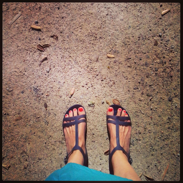 Não eram as sandálias óbvias para este vestido (na minha cabeça, pelo menos). Mas ontem, quando o escolhi, não pensei no calçado. E hoje, 7h30 e muita pressa, a decisão teve de ser rápida. As brancas estão velhas, não, só em último caso. Estas ficam mal, este verde não combina, estas demasiado formais... E, de repente, as azuis esquecidas por baixo de uma cadeira. É isto. Provavelmente nem me teria lembrado. Mas assim de repente o que não era nada óbvio era a combinação ideal.